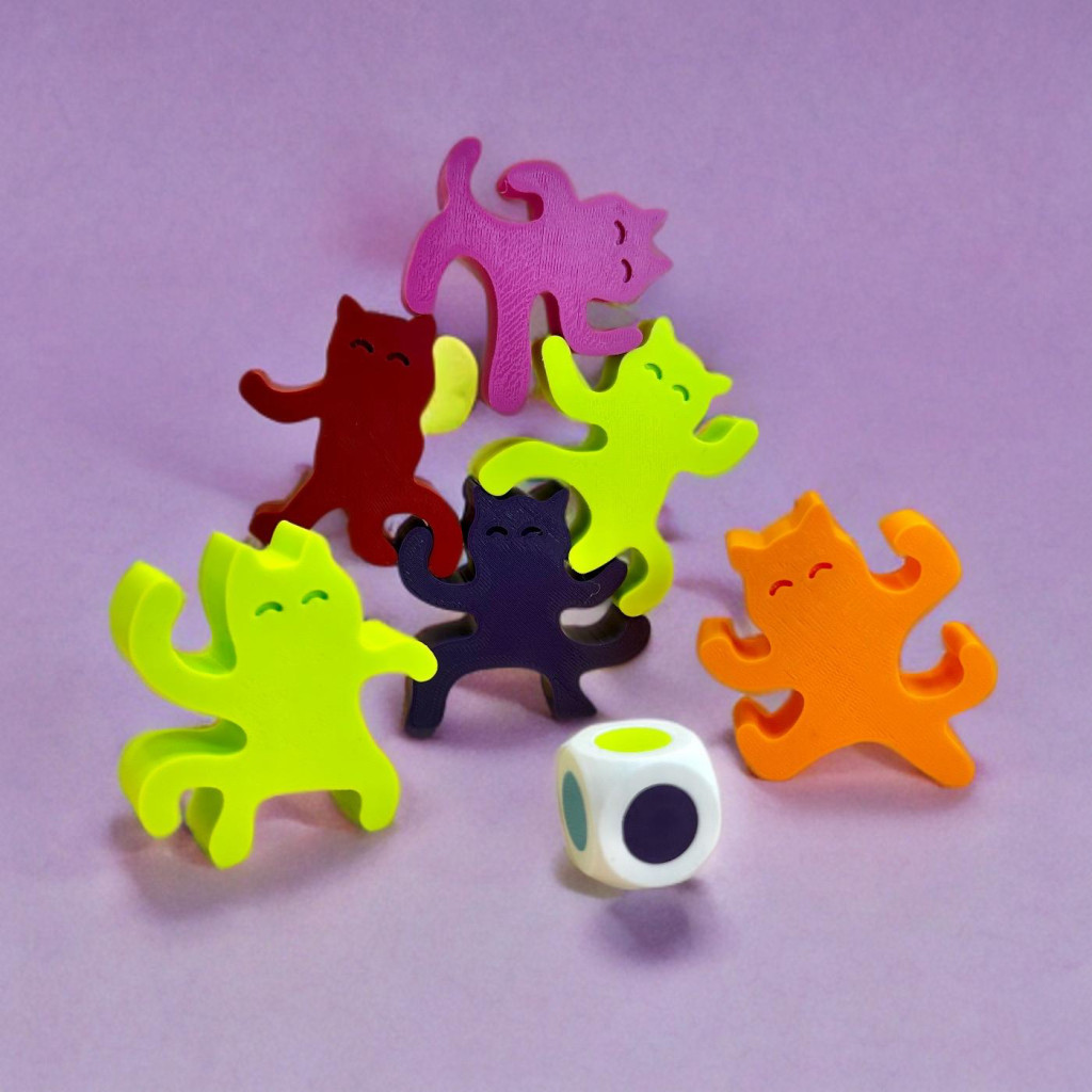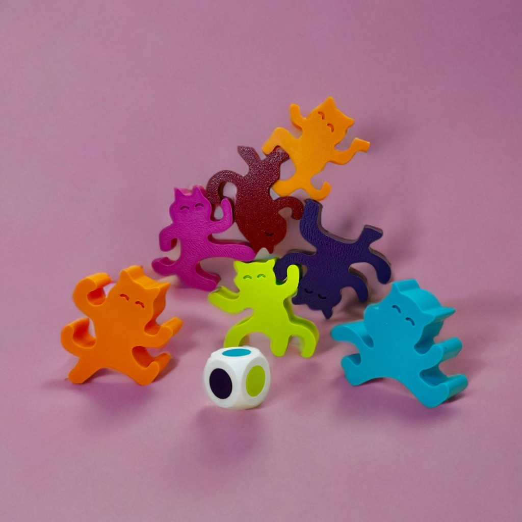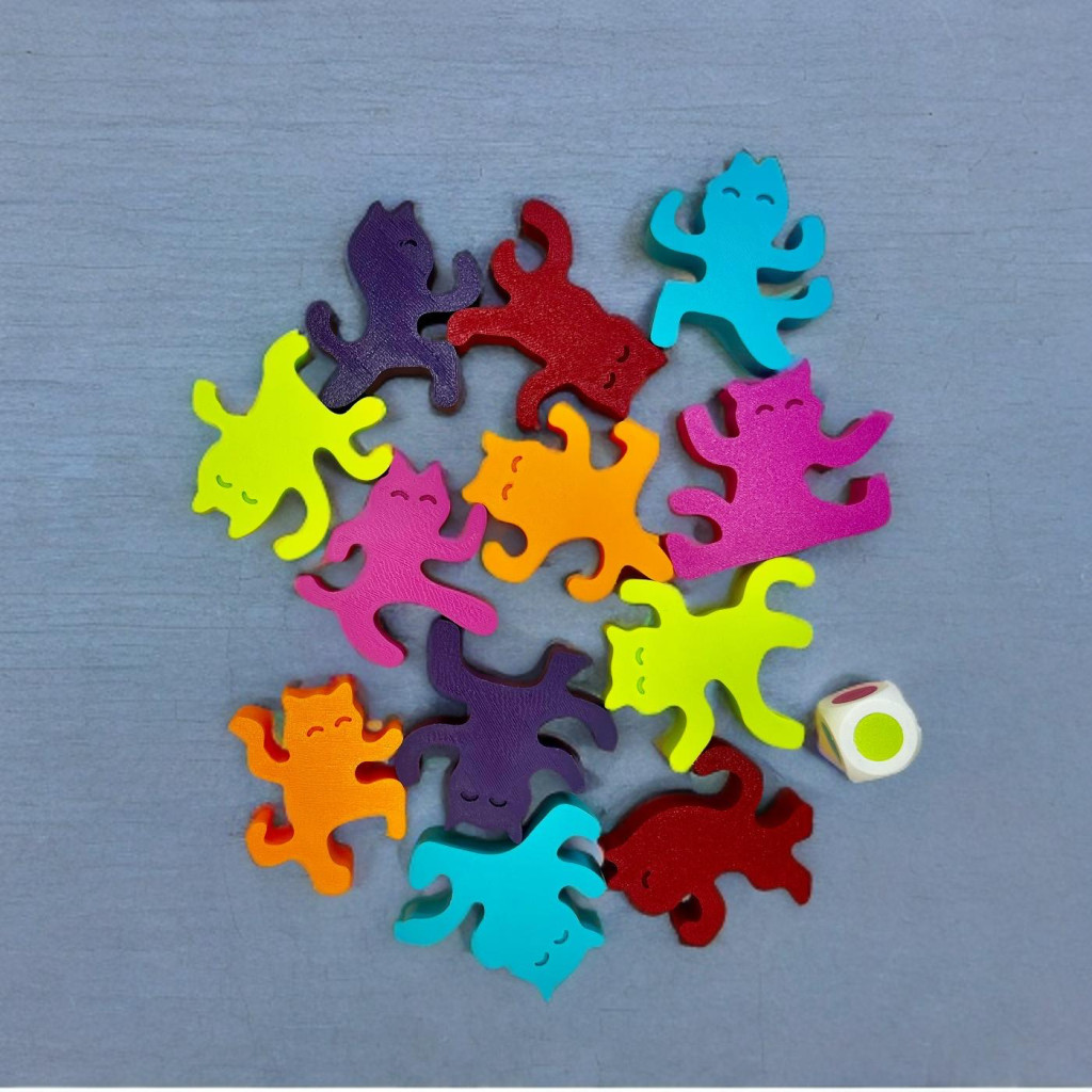 A Társasjáték tartalma: 12 db különböző formájú macska 6 színben.