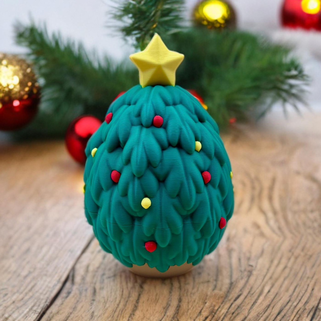 Ez egy különleges, karácsonyfa mintájú tároló tojás, mely 15 db Mini karácsonyi figurát rejt.