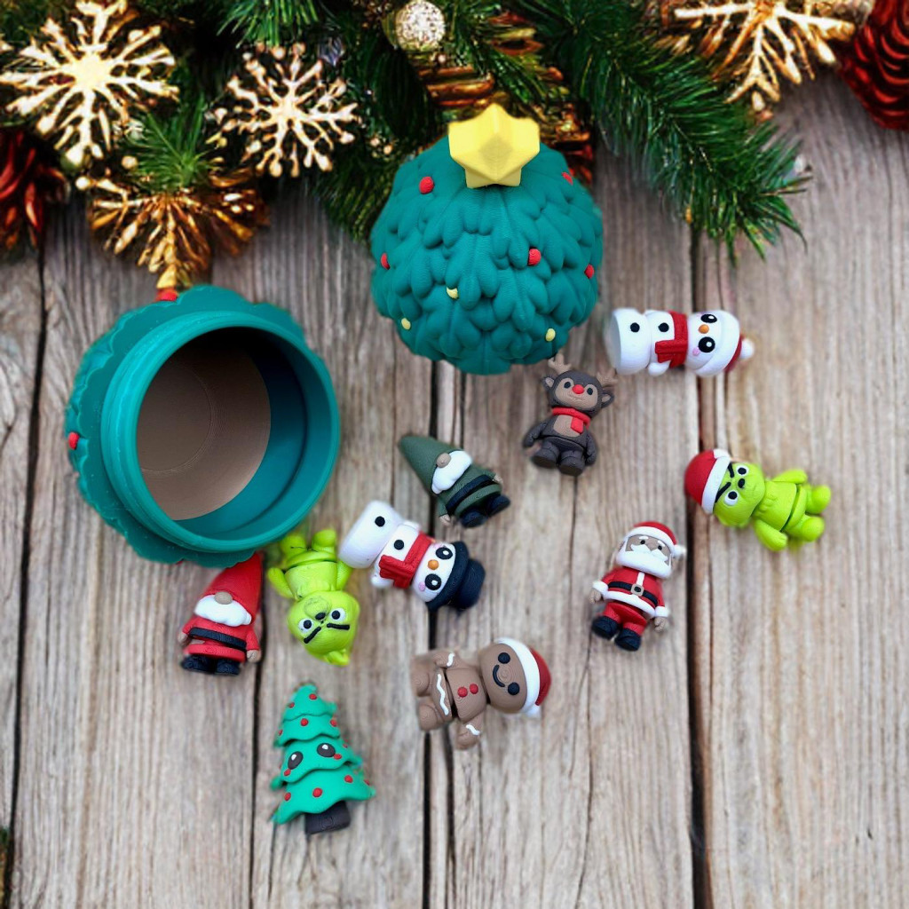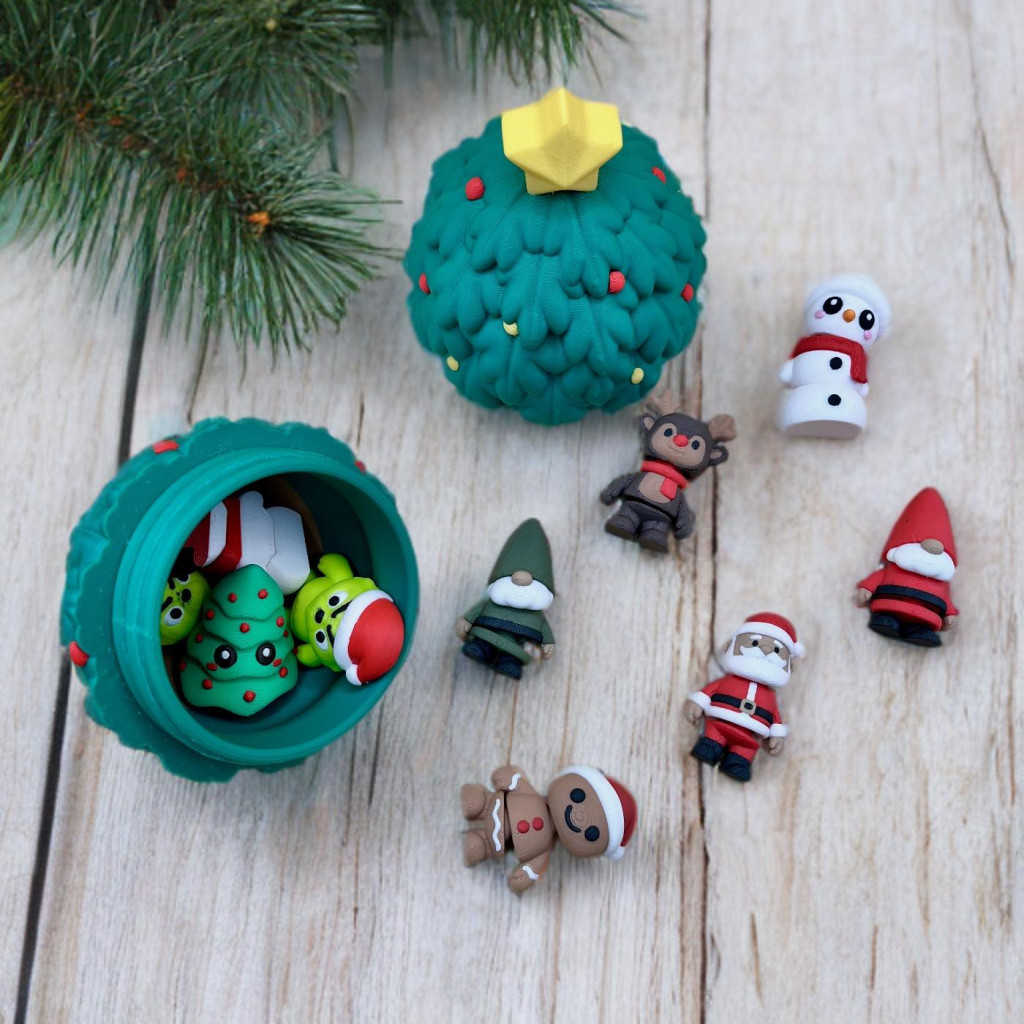 Ez egy különleges, karácsonyfa mintájú tároló tojás, mely 10 db Mini karácsonyi figurát rejt.