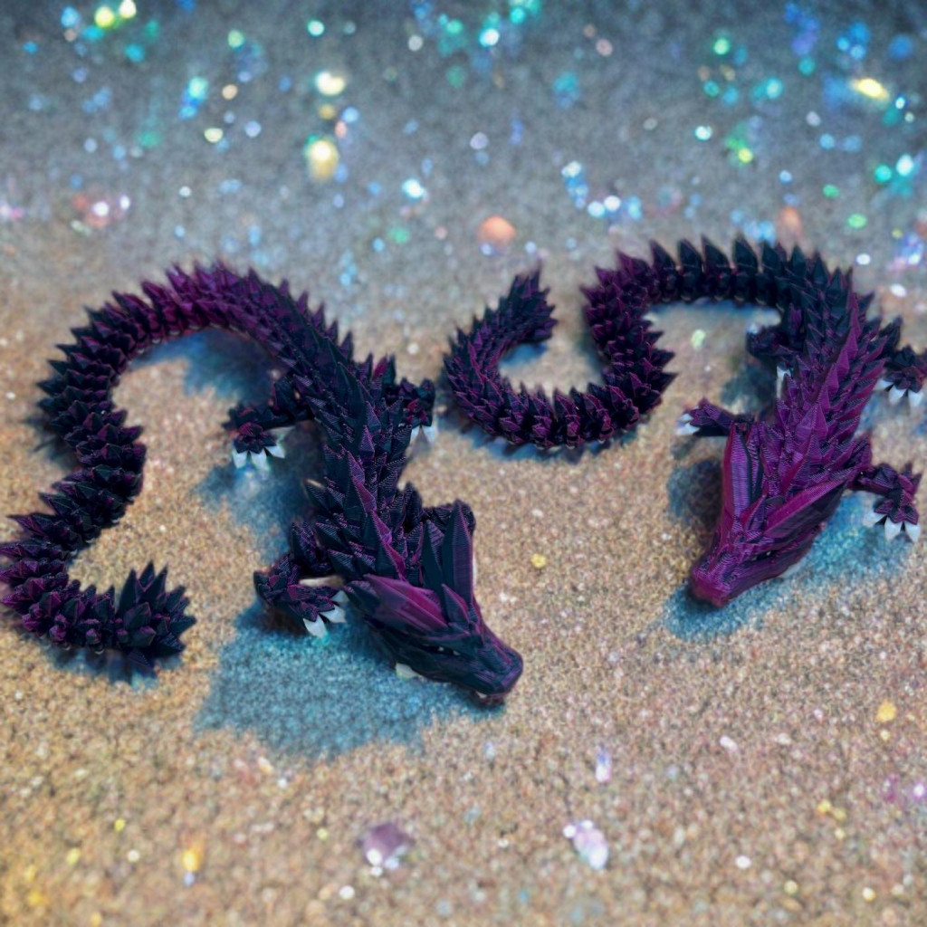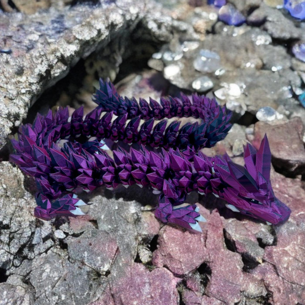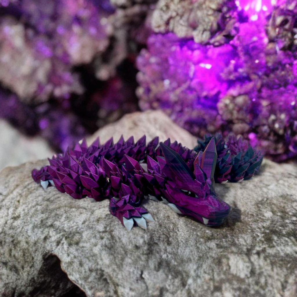 Ez a 3D nyomtatott kristálysárkány valódi látványelem: a gyöngyházfényű lila és mély fekete árnyalatok minden fényben másként csillannak meg, mintha a sárkány saját varázsereje kelne életre.