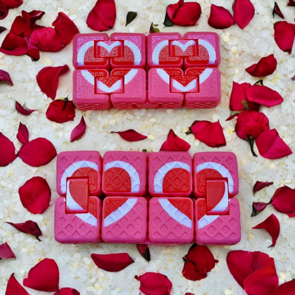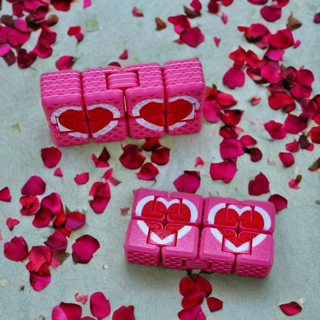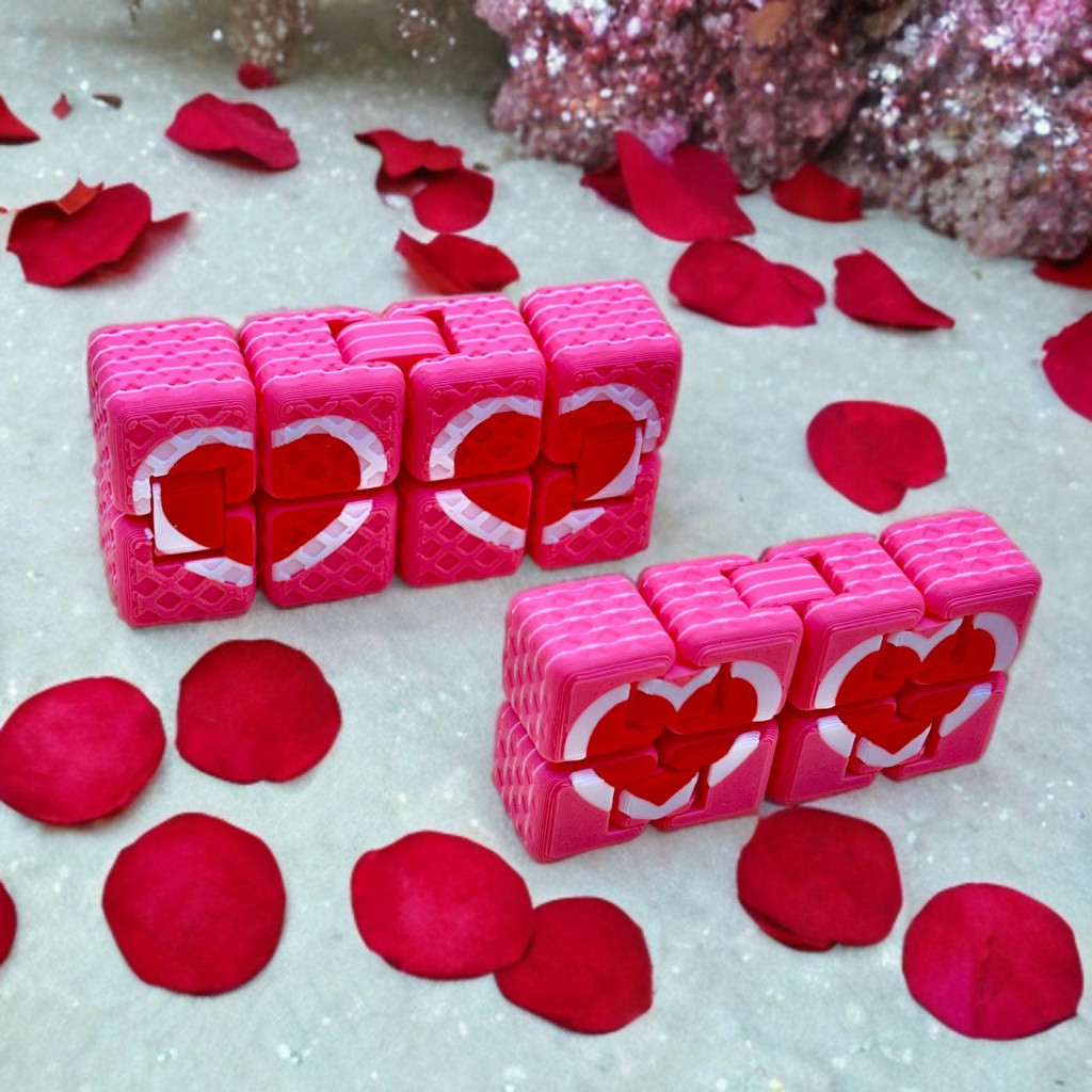 A szivecske mintás végtelenkocka egy különleges, forgatható–hajtható stresszoldó játék, amelyben a szeretet és a végtelenség találkozik. A kocka elemei folyamatosan mozgathatók, így soha nincs „vége” – pont, mint a szívecskés üzenet, amit közvetít.