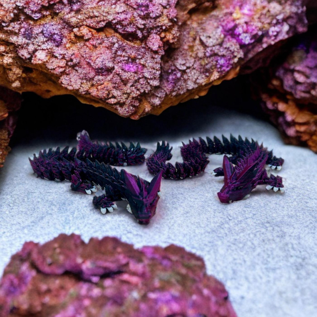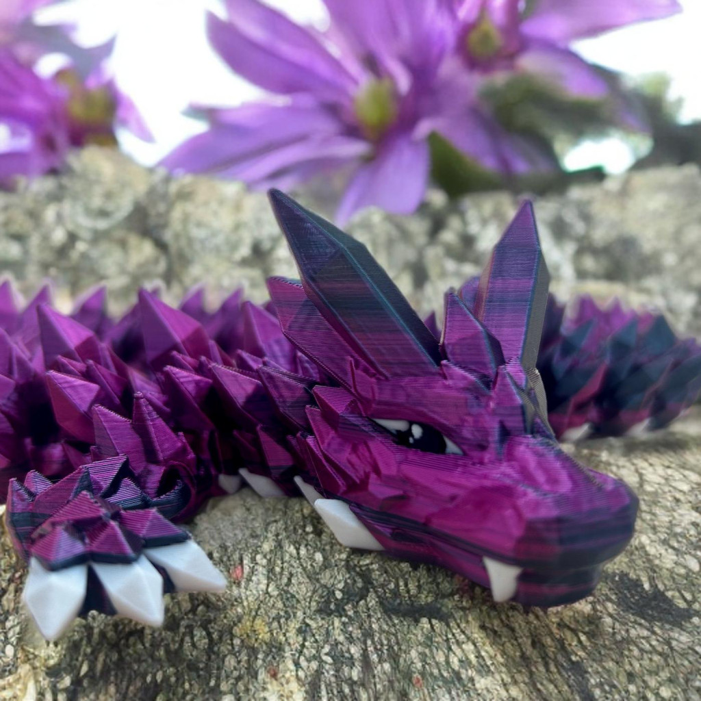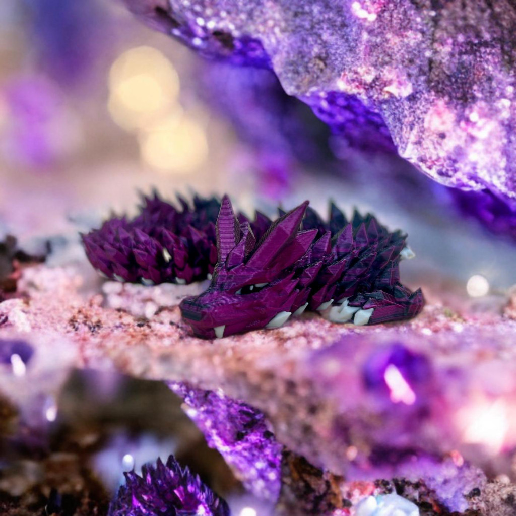 Ez a 3D nyomtatott kristálysárkány valódi látványelem: a gyöngyházfényű lila és mély fekete árnyalatok minden fényben másként csillannak meg, mintha a sárkány saját varázsereje kelne életre.